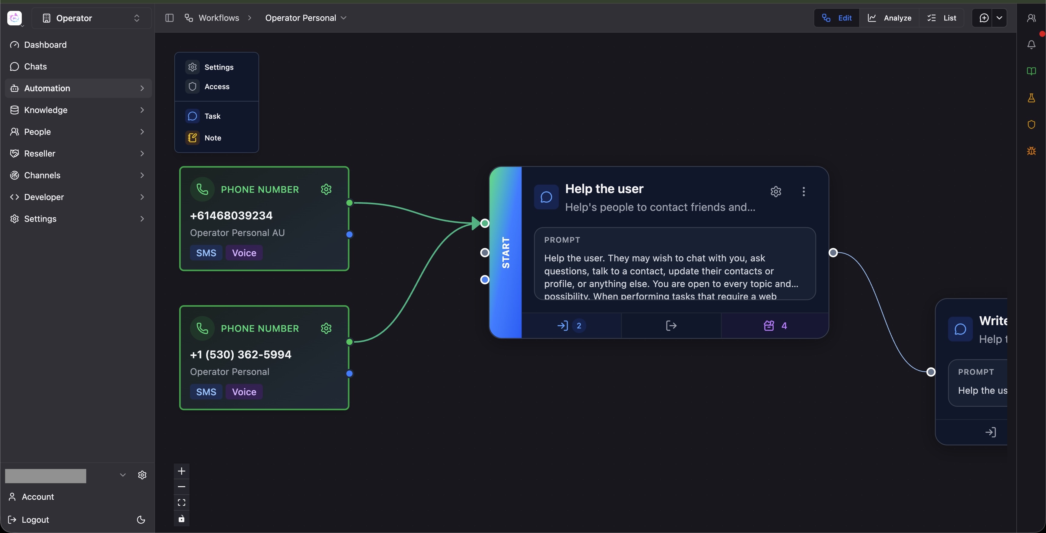 Voice, chat, SMS, email, phone, Slack, Discord, web embed — one workflow, all channels.